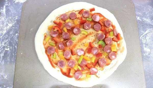 5、在撒香腸片和彩椒丁的時候,註意要在面餅中間留出一些空白,這樣可以使得在後期切披薩的時候不會有食材掉下來。