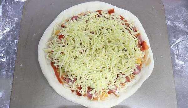 先將準備好的面粉或入幹酵母揉成面團,發好後搟成面餅,用竹簽紮出小孔,防止烤披薩的時候起包,向上面撒上切好的香腸以及青椒彩椒等配菜,再撒上一層厚厚的芝士,註意中間要留有空隙,這樣可以防止在披薩熟瞭之後切披薩的時候食材掉下來,把面餅放入烤箱當中上下火200度,烤15分鐘左右就可以瞭。制作方法非常的簡單,我用的是香腸和青椒,喜歡其他食材的朋友也可以放上一些其他的食材,比如培根牛肉或者是一些水果等等,大傢可以根據自己的喜好進行適當的調整,不同的食材可以搭配出不同的美味。