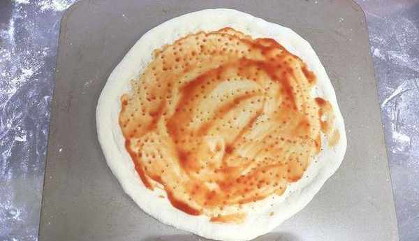 4、把面餅放在烤盤上,用餐叉或者牙簽在面餅上紮出一些小洞並塗上少許的番茄醬。