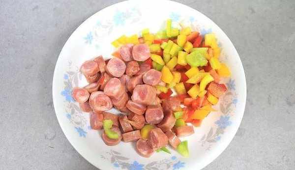 2、將準備好的彩椒切成丁狀,把香腸切成香腸丁,放入盤中備用。