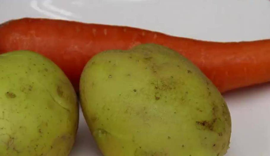 今天用一個胡蘿卜和兩個土豆給大傢分享一個好吃的,首先先把土豆的外皮給它去掉,把胡蘿卜皮也給它去掉,再把土豆擦成細絲,擦成這樣的細絲就可以瞭。再把胡蘿卜也擦成西絲,然後根據自己的口味加入適量的鹽、五香粉、胡椒粉,用筷子攪拌均勻殺水10分鐘,10分鐘以後在裡面加入普通面粉,邊加邊攪拌,土豆的出水量不同,增加的面粉也不同,最後攪拌成這種比較黏稠的狀態就可以瞭。先放在一邊備用。