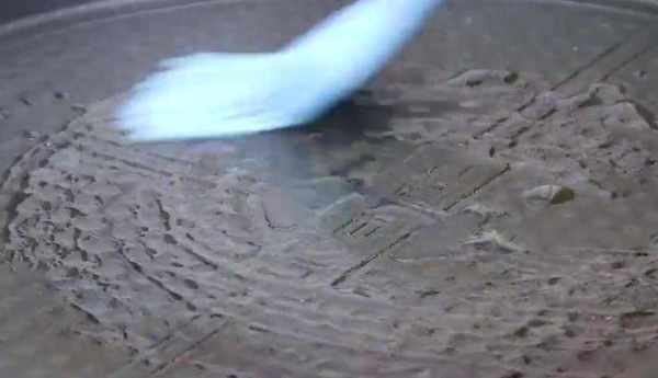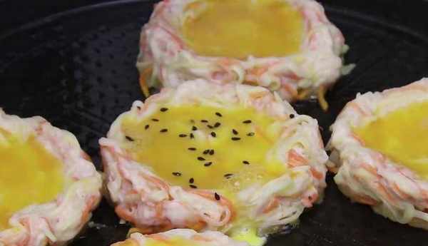 然後在碗中倒入兩顆雞蛋,在雞蛋裡面加入少量的鹽,用筷子攪散被用,電餅鐺預熱好以後刷油,然後在手上抹上點食用油防粘,取一塊面團放在手心的位置團圓,在中間的位置戳個洞做成鳥巢的形狀,然後把它放到電餅鐺裡,全部放進去以後,在每個餅窩裡面加入適量的蛋液,在裡面點著一點黑芝麻更香更好吃。