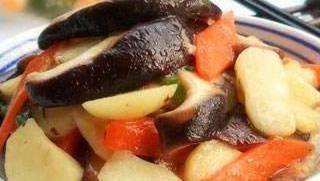 3. 炒鍋置中火,下入花生油,至七成熱,將香菇入鍋炒香,烹入黃酒,加醬油、白糖和水150毫升,沸滾片刻,放入地栗片和精鹽;