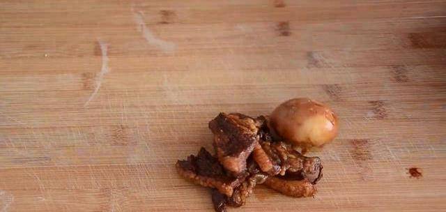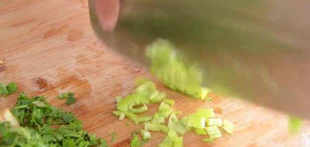 五花肉和雞蛋都做好瞭,把它們放到案板上切碎,準備一把香菜切碎,一個尖辣椒切碎。準備一把小刀像這樣把它劃開。放上我們剛才調好的餡料,我們的肉夾饃就做好瞭,肉夾饃這樣做的太好吃瞭。