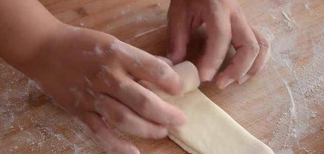 加入花椒、八角、桂皮、香葉、辣椒,加入清水,沒過五花肉即可加入一勺老抽上色,蓋上蓋子,大火煮開中火蒸20分鐘。時間到瞭,再放上三個煮熟的雞蛋,蒸上10分鐘,面也發好瞭,裡面是蜂窩狀,把它拿出來揉一下。揉好以後搓成長條。我們再切成大小均勻的劑子,取一個面劑揉圓按扁。再用搟面杖搟成牛舌狀。