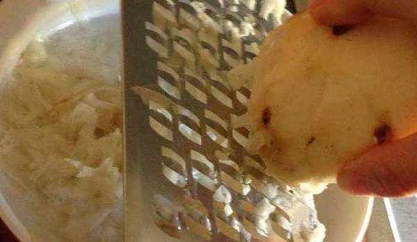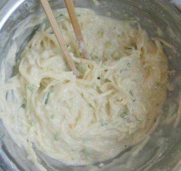 2、把土豆用工具擦成細絲,我用的是寬一點的,這樣土豆不是那麼的軟,不過大傢也可以細一點的也可以的。