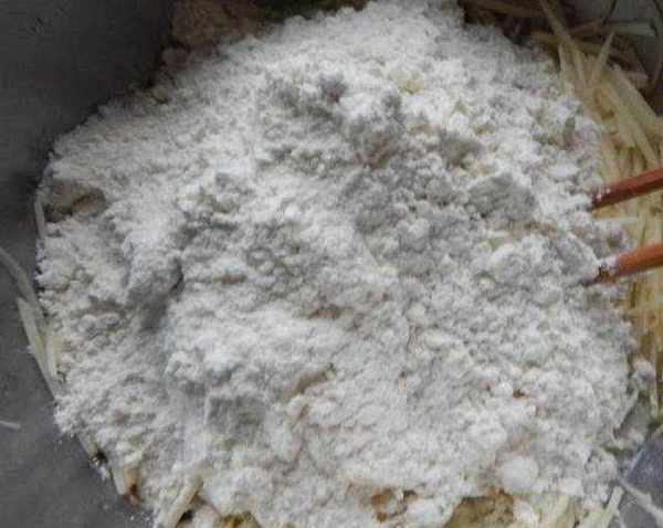 3、細絲擦好後,就可以倒入少許面粉,然後在加點的鹽用來調味,口味重的可以多放一些,口味淡的也可以少放些,這些都可根據你個的口味來做。