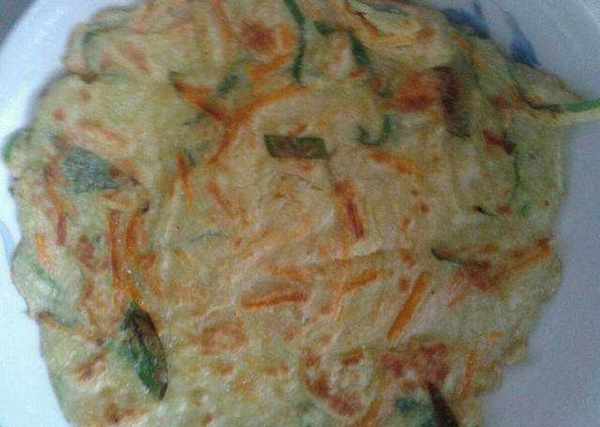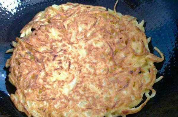 6、在平底鍋加入花生油,在把土豆面糊倒入,用勺子壓成薄一些的餅狀,有小火煎,煎到兩面金黃即可出鍋,完成瞭,