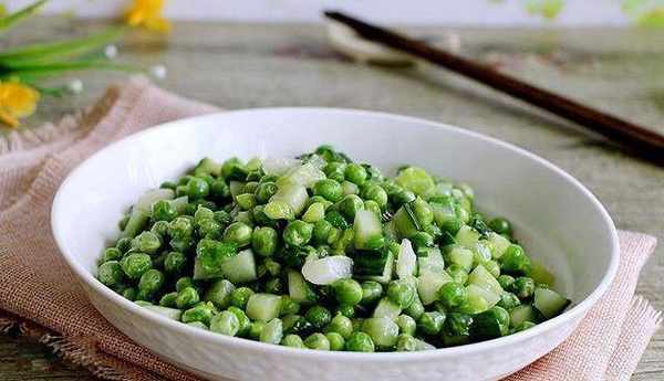 材料:鮮豌豆 300克、黃瓜 大半根、蔥 1小段、植物油 適量、鹽 適量、水淀粉 適量