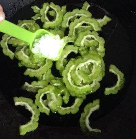 鍋燒開水,加入鹽和幾滴油,下苦瓜焯水。