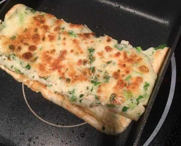 3、 熱鍋中加入少量食油,小火,等油熱後加入適量面糊,攤開,記得一定要攤得均勻哦,這裡就很考驗攤餅的技術瞭,等兩面都煎得金黃後就可以出鍋瞭