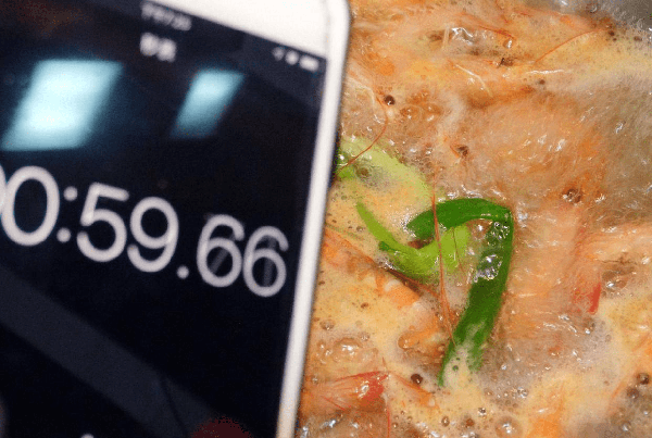 開水下鍋可以讓蝦肉中的蛋白質迅速凝結鎖住鮮味,60秒大蝦能達到7分熟,過涼水讓蝦肉更勁道。