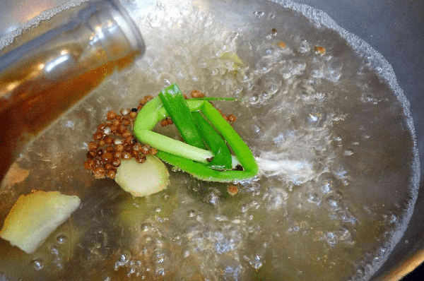 步驟三:鍋內再次燒水,下入香蔥結、生薑片、花椒粒、料酒,燒開煮兩分鐘。