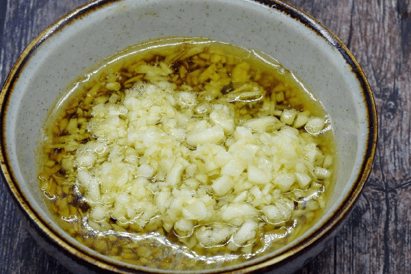 步驟五:熬制蘸料,薑切細末放入碗中,加入海鮮醬油、香醋、白糖、蠔油攪拌均勻,薑蒜末下鍋炒成金黃色,連油倒入碗汁拌勻即可。