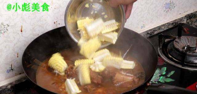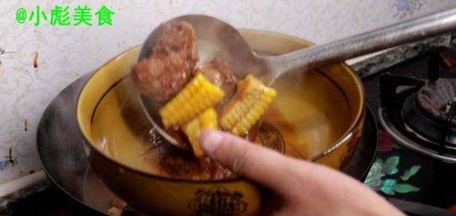 14、將排骨倒入鍋中、再放入玉米開火、開鍋之後、改成小火。用小火煮三分鐘、玉米就熟瞭。