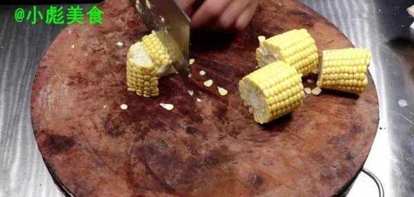 3、玉米切成小塊、然後一分為四、全部切完、裝入小碗中。