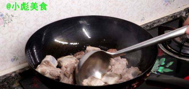 7、另起鍋、先燒幹來少許油、倒入排骨、先把排骨煎至兩面微黃。