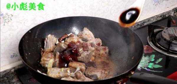 9、來一勺排骨醬、一勺蠔油、兩勺生抽、一勺醬油或者老抽、兩勺料酒、給排骨翻炒上色。