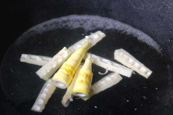 1、把小筍子拔回來之後,去掉它的筍殼,接著把它切一下,從中間直接把它切開,對其焯水。