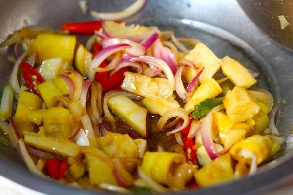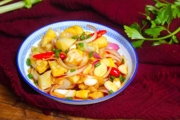 所需食材:筍子2根、洋蔥半個、小米辣3個、蔥段、蒜片、香油、鹽、醬油半勺、香醋半勺