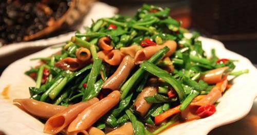 我們可以準備海腸子300克,韭菜500克,先將海腸子去除內臟清洗幹凈後切成小塊,韭菜洗凈切成寸斷,接下來我們取鍋燒熱油,江海腸子用蠔油爆炒一小會然後加入韭菜大火煸炒,加入少許的食用鹽進行調味即可,不用添加任何調料瞭,以免營養配破壞,翻炒至成熟即可食用瞭。