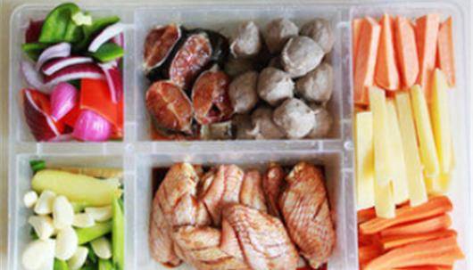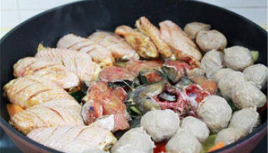 等到蔬菜斷生之後,我們在整個鍋上邊平鋪上我們準備好的三樣主料,有雞翅中,鯰魚,還有牛肉丸。