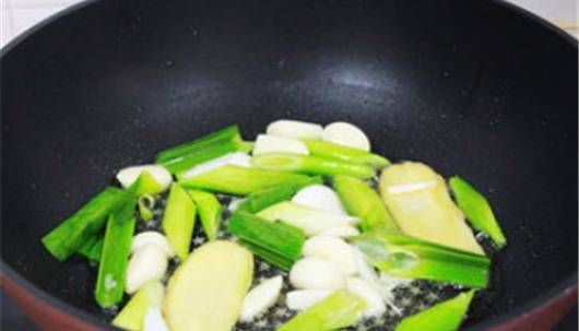 然後我們就可以開始起鍋,熱油炒菜瞭,先在鍋中加入適量的食用油,燒熱之後先下入蒜苗,生薑和大蒜去炒出香味。