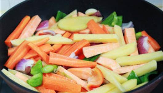 然後我們往鍋中倒入紅薯土豆和胡蘿卜條,用小火把它們翻炒均勻。