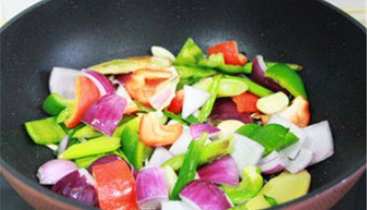 接著我們網絡中加入已經切好的洋蔥和青紅辣椒去翻炒均勻,在切的時候要將青紅菜椒和洋蔥保持差不多的大小,而且塊頭要稍微大一些,這樣吃起來口感更加清脆更好吃。