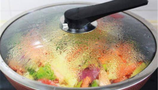 接著往鍋中加入適量的清水,基本上加到菜肴的一半就可以瞭,蓋上鍋蓋,然後用小火慢慢的燜煮,確保鍋中的蔬菜被燜熟。