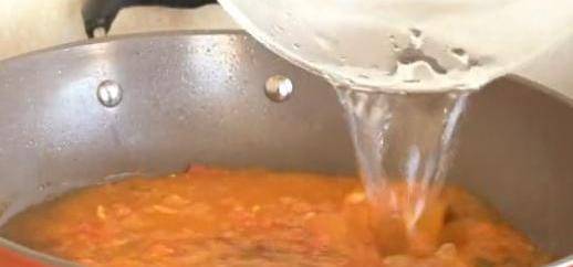 把西紅柿炒出湯汁,炒好後,倒入適量清水。