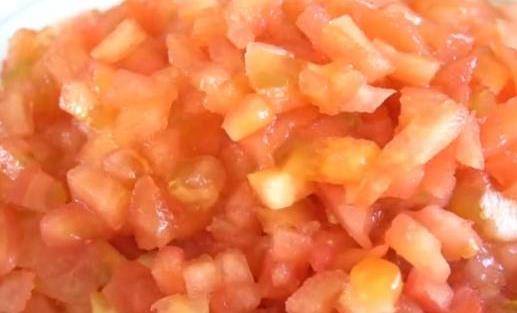 2個西紅柿清洗幹凈,劃十字刀,放進碗裡,然後用開水燙2分鐘,去掉外皮,再切成丁。