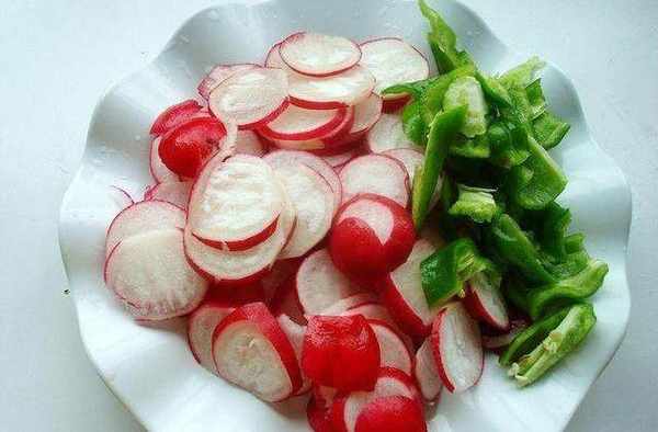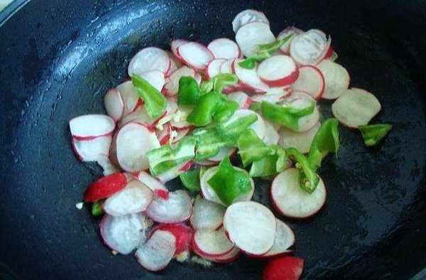3、水蘿卜洗凈切薄片,薑切末,青辣椒洗凈切斜塊