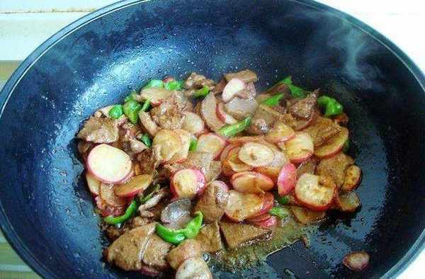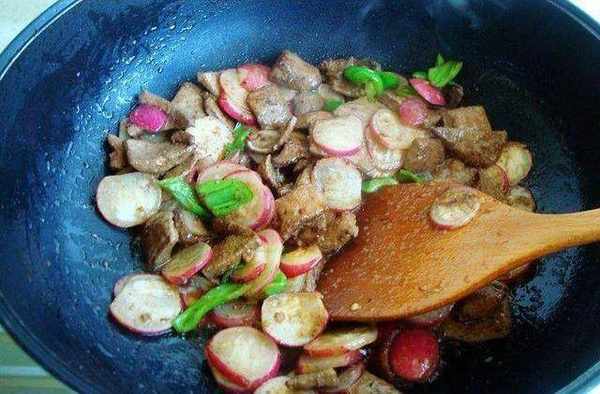 豬肝我都是鹵和炒的多,豬肝想必大傢都知道,對眼睛有好處,也是最理想的補血佳品之一,具有補肝明目、養血、營養保健等作用,可用於治療血虛萎黃、夜盲、目赤、浮腫、腳氣等癥。特別是富含維生素A和微量元素鐵、鋅、銅,這些對於電腦族來說,可以保護眼睛。我一周都要炒一次,搭配胡蘿卜炒的最多,這次就換換口味瞭,用春天的時令菜水蘿卜(也叫櫻桃蘿卜,小蘿卜等)一起炒瞭,真是又下飯又好吃。