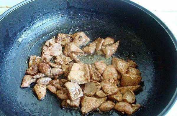 4、熱鍋涼油,油熱7成下豬肝,翻炒變色變堅硬撈起