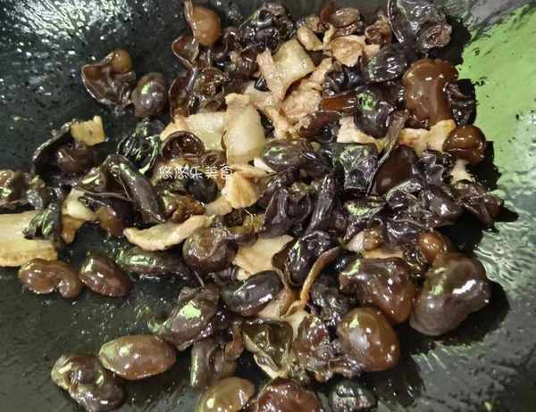 5.食材炒至成下圖這種焦黃的狀態後,油脂也出來瞭。如果裡面的油偏多,可以倒一些出來,剩餘留著炒。倒入洗凈後的黑木耳,用鏟子將鍋中的食材翻炒均勻,炒的過程中,如果擔心會炸鍋,可在鍋中撒入一點點的水,然後繼續翻炒;