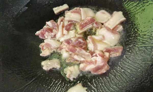 4.準備一個幹凈的鍋,鍋中的水分幹後,倒入一點點的油,隨後倒入切好的肉片。要冷油下鍋,這樣才不會發生濺油。肉放入鍋中後,用小火將鍋中食材煸炒出油;