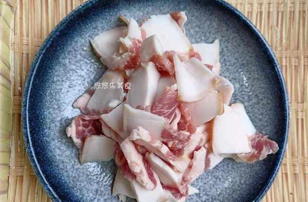 3.準備好的三層肉放入清水中沖洗幹凈,洗凈後的肉放在案板上,用刀切成細片,切好的肉放在盆中備用。切肉的時候不要切得太厚,盡可能地薄片,炒的時候容易將裡面的油脂煸炒出來;