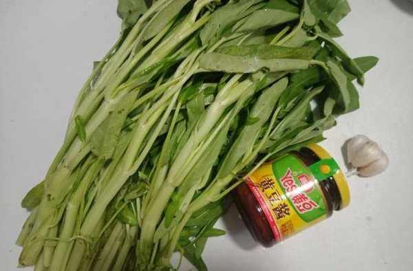 【清炒空心菜的材料】:空心菜500克,大蒜3瓣,黃豆醬1湯匙,生抽1湯匙,鹽1/3鹽勺