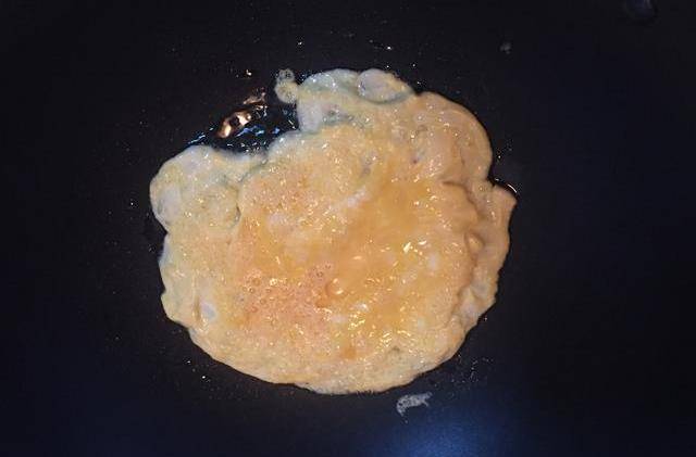 坐鍋點火,油溫5成熱,到入雞液,先不要晃動,等定型後翻動壓碎就可以瞭(盡量把雞蛋煎的老一點)。