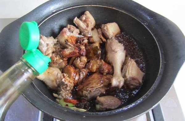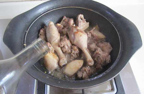 6.翻炒至冰糖完全融化後加入料酒進去煸炒;