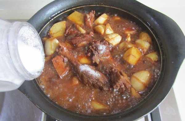 5.翻炒幾下後加入冰糖進去翻炒;