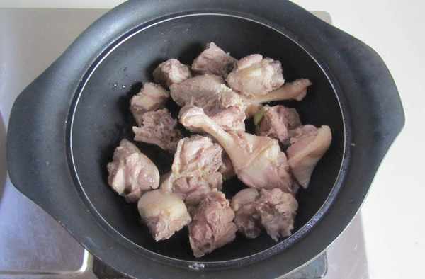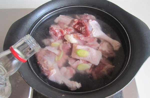 2.鴨腿肉塊放入冷水中焯煮,加入幾片薑和適量的高度白酒幫助去腥;