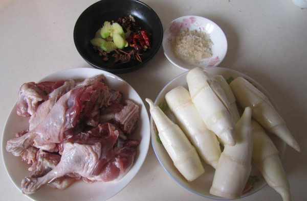 【茭白燒鴨腿】原料:鴨腿肉2片茭白500克八角1個桂皮1塊香葉1片紅椒1個冰糖1小蝶高度白酒2勺料酒2勺生抽1勺薑片3片油鹽適量制作:1.準備好原材料;