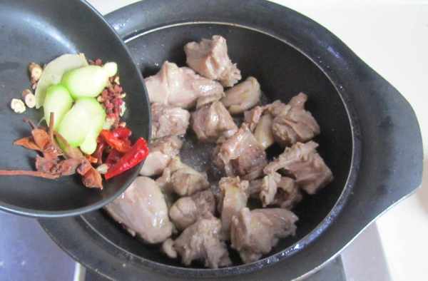 4.煸炒至微微出油且表面發黃時放入大料和薑片進去翻炒;