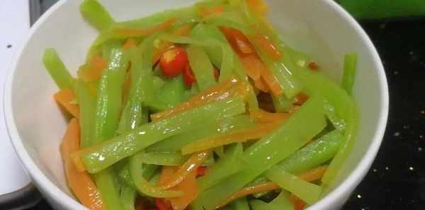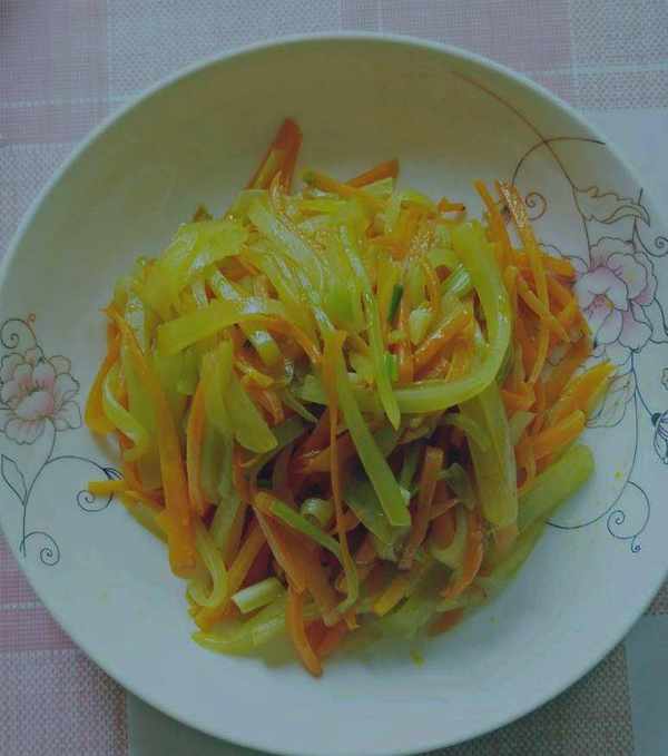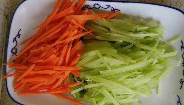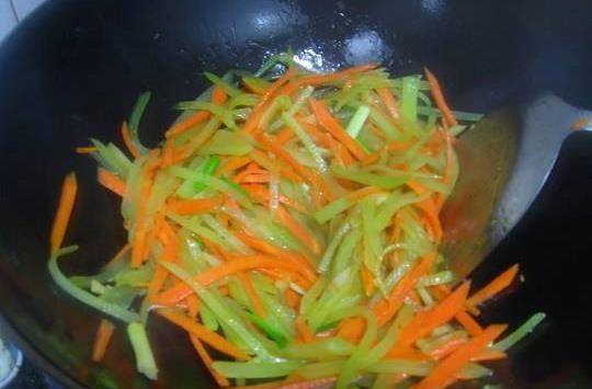 3:萵筍絲和胡蘿卜絲,炒制時放入足夠的食用油,大火快速翻炒即可,鍋中不要兌水。
