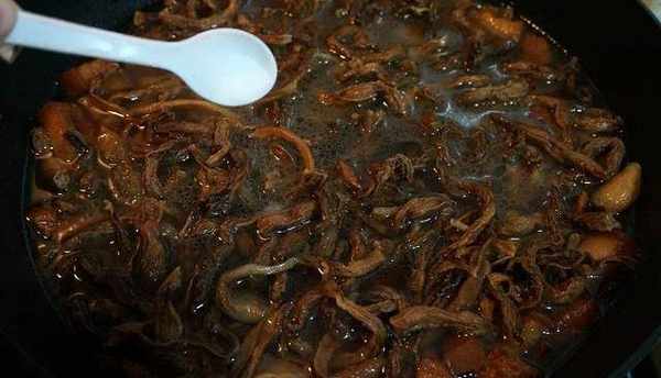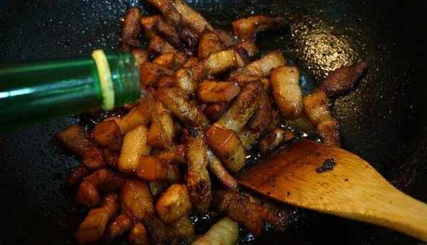 5.如果油很多,我們將它倒出一點,否則會太油膩,進食時會更加油膩。倒入一點白酒,聞一下肉的味道。
