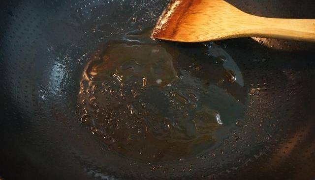 3.將少量油倒入不粘鍋中,然後倒入少量冰糖。溫度升高後,我們用鐵鍬將冰糖煎幾次,以加快速度。當冰糖融化時,它逐漸變成焦糖。