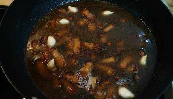 6.煎幾次,將去皮的大蒜放入鍋中,然後將兩個八角茴香放入鍋中,翻炒幾次。