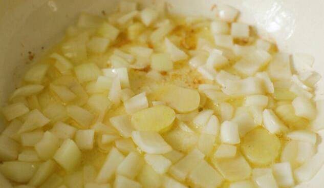 2、從鍋中盛出煎好的雞翅;不用關火,洋蔥塊、蒜片直接倒入鍋中剩餘的油中炒香;
